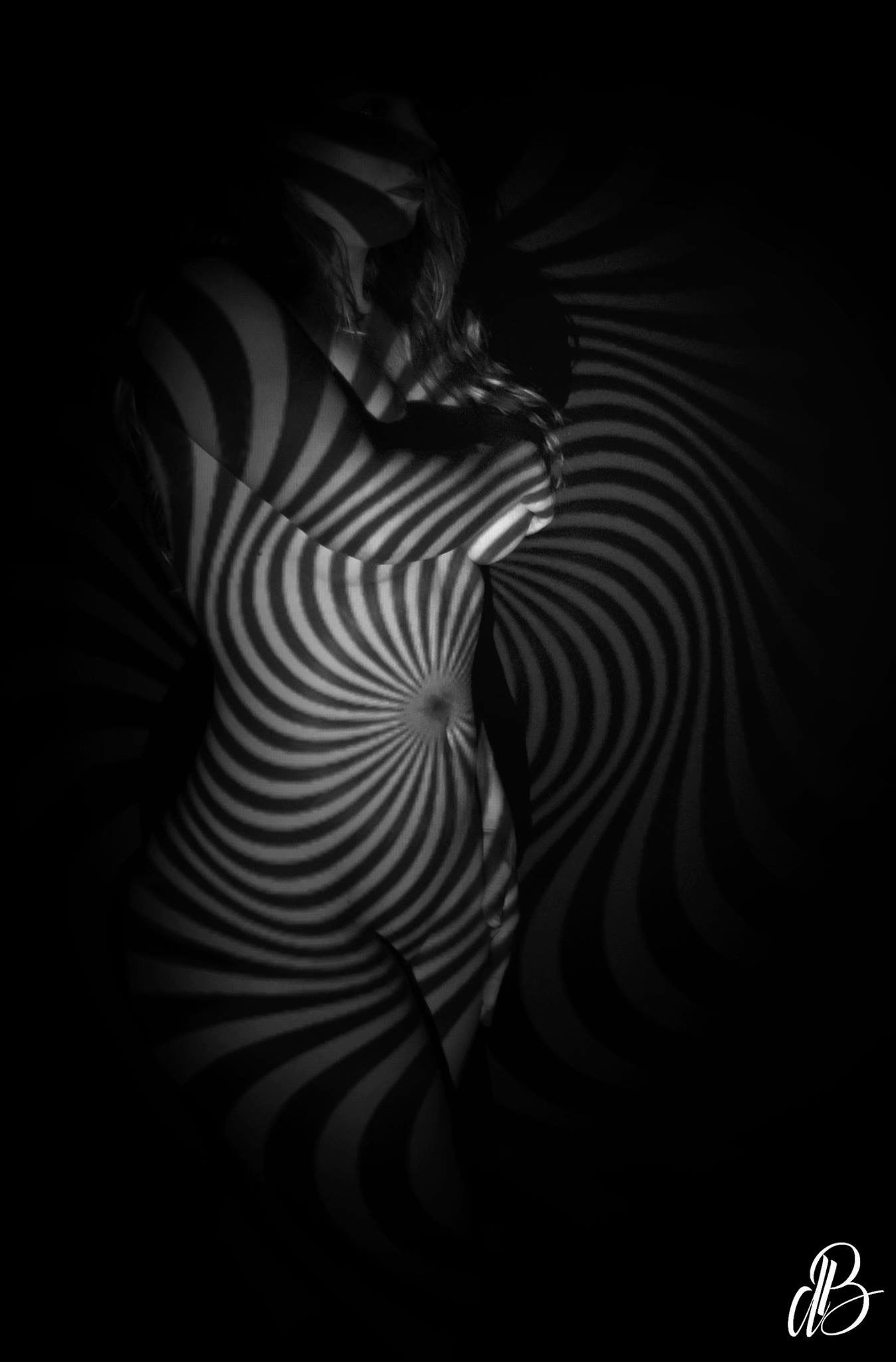 Avant de se lancer, je montre la pose que j’aimerais photographier; le modèle, à ce moment là, est en peignoir. Lorsque tout est ok, je plonge le studio dans le noir, laisse la personne se dévêtir et se placer. Au feu vert, j’allume le vidéoprojecteur (qui servira à projeter les rayures sur le corps) et m’assure que les parties intimes soient dans l’ombre ou cachées. Et en réalité, le rendu visuel est plus foncé que sur les photos présentées en haut de cet article. Les clichés seront éclaircis par la suite. En résumé, je ne vous vois jamais nue en pleine lumière!!