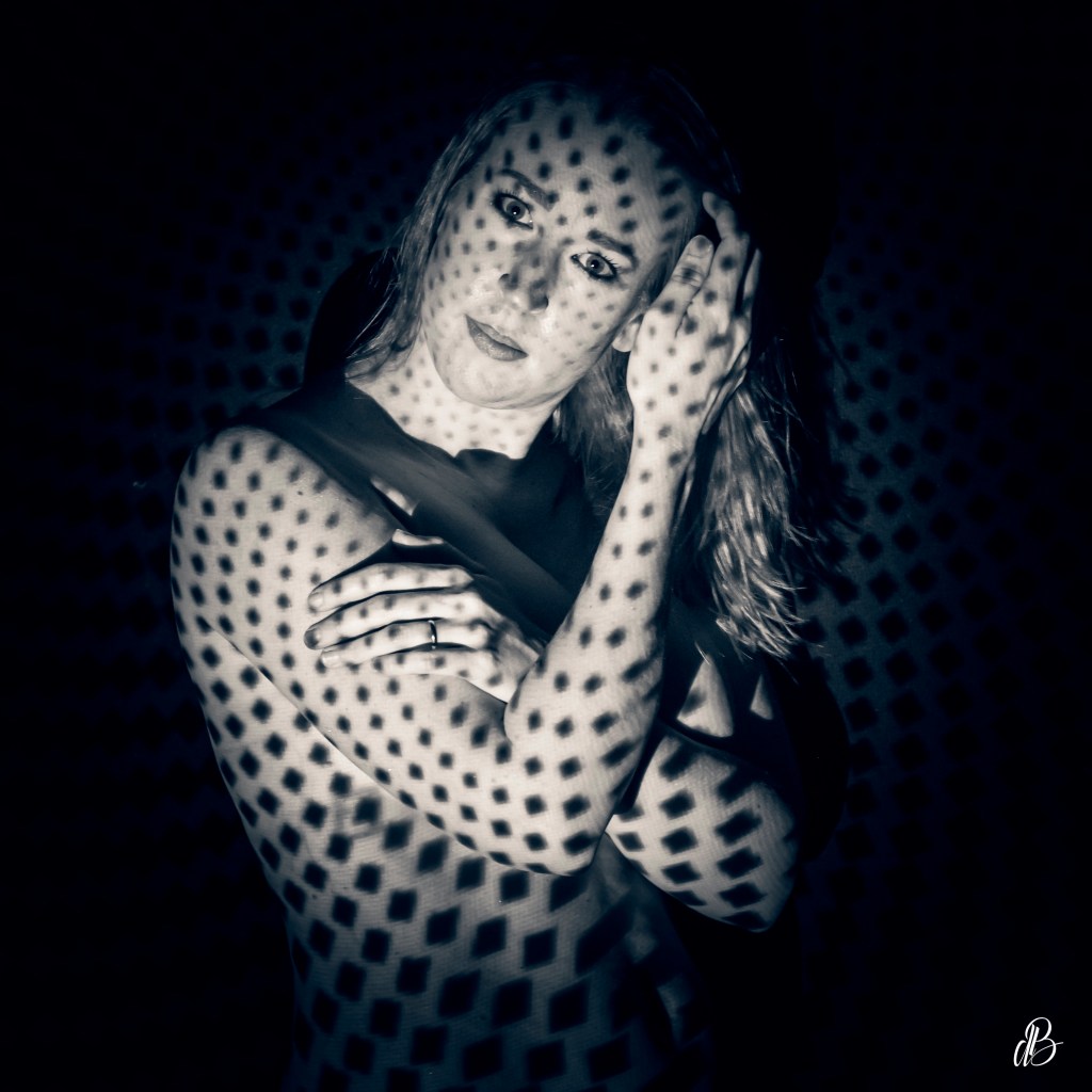 La pièce est plongée dans la pénombre. Je suis en peignoir et David m’explique quelle pose adopter puis il sort et je m’installe. Il revient quand je lui dis et positionne le projecteur de lumière (de rayures, de courbes ou de points) pour que mes yeux soient dans la lumière. Il prend une série de clichés puis on change de pose, toujours dans l’obscurité, de sorte qu’il ne me voit jamais complètement nue.